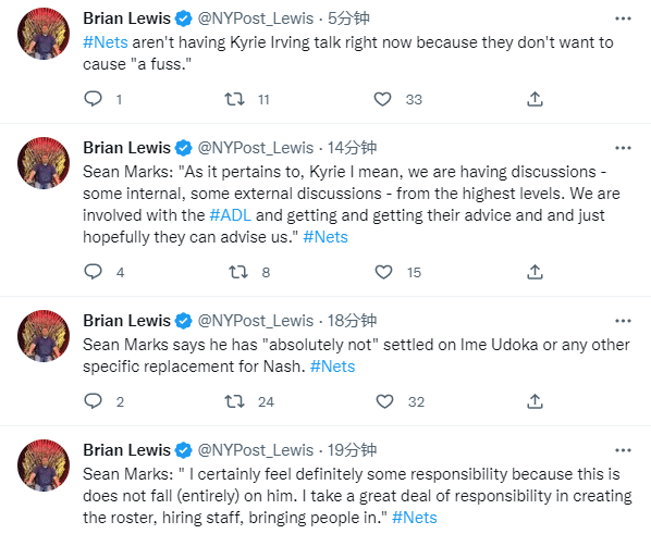 篮网马总表示:有关纳什下课的决定,杜兰特和欧文都没有任何参与,没有球员参与且球队没有征求球员的意见,他们都被提前告知了。
