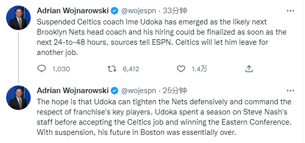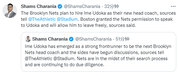 ESPN名记沃纳罗斯基则报道,预计篮网将在24-48小时内与乌度卡达成一致,乌度卡已经非常接近成为篮网新帅,希望乌度卡能提升篮网的防守。