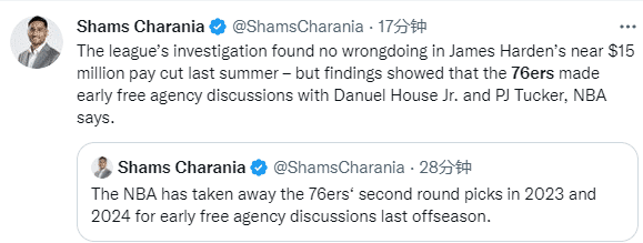 据名记Shams跟进报道,联盟调查结果显示,哈登今夏降薪1500万美元与76人达成提前续约的操作中没有任何不当行为和违规。