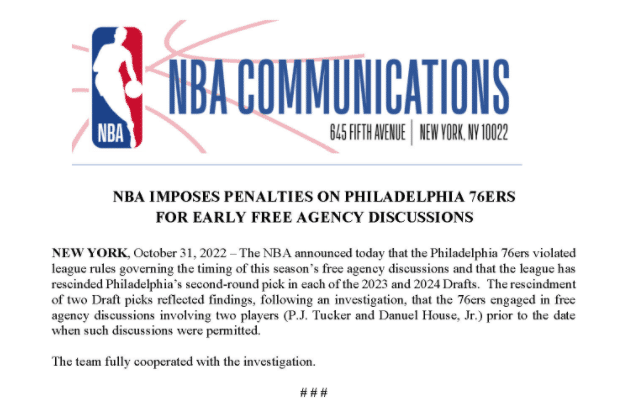 NBA官方宣布,因在今年休赛期过早接触自由球员PJ-塔克与豪斯,76人被罚剥夺2023年和2024年的次轮签;官方在声明中表示,76人在自由球员接触时间节点开启前就与PJ-塔克和豪斯进行了接触,此次处罚表明了联盟的调查结果。