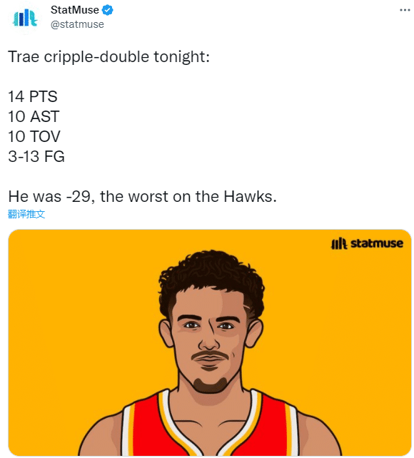 特雷-杨进攻手感冰凉,还单场出现多达10次失误,失误创生涯新高,也是生涯首次拿到得分、助攻和失误皆上双的另类三双数据。