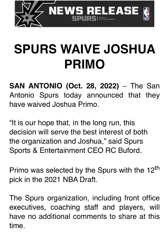 对于裁掉普里莫,马刺总经理RC Buford在一份声明中表示:从长远来看,这一决定对球队和约书亚(普里莫)的最佳利益是有益处的,这是我们双方都希望做出的决定。