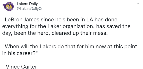 文斯-卡特替老詹抱不平,表示:自从来到洛杉矶以来,勒布朗-詹姆斯为湖人队做了一切,挽救了局面处理了他们的烂摊子并且成为了英雄;在他职业生涯的这个阶段,湖人队什么时候会为他做到这一点?