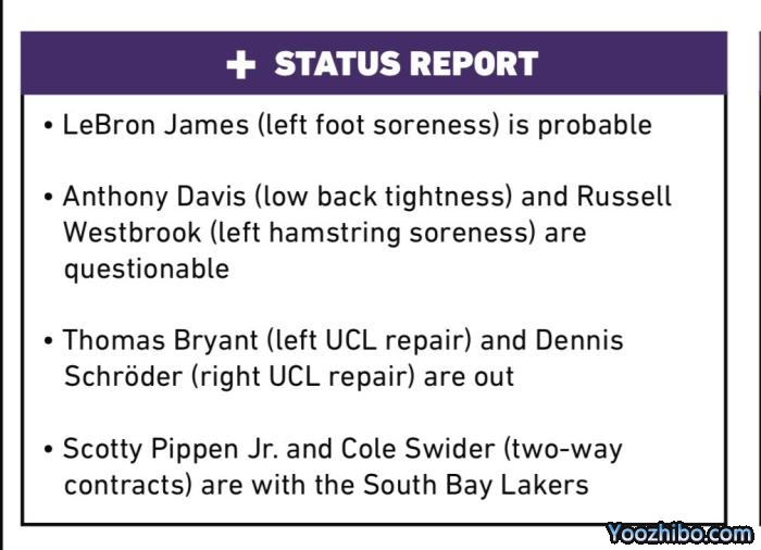 湖人何时才能拿到赛季首胜?没人知道,开赛至今,湖人一直遭遇伤病的困扰;湖人已经官宣下一场对阵森林狼的伤情报告:詹姆斯(左脚酸痛)大概率出战(75%出场可能);浓眉(腰部肌肉紧张)、威少(左腿筋酸痛)出战成疑(50%出场可能)。