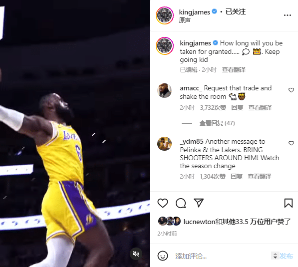 詹姆斯晒出在湖人与掘金比赛中的扣篮视频,配文写道:还有多久你会被认为是理所应当的,继续前进,孩子(王冠表情)。