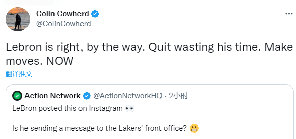 目前湖人开赛4连败,先后输给勇士、快船、开拓者和掘金,进攻效率十分糟糕,外线投射同样糟糕至极;詹姆斯如此动态引热议,美媒猜测詹姆斯是在向湖人管理层传达信息吗?美记者CoLin Cowherd表示:勒布朗是对的,顺说一句,别浪费他的时间了。湖人现在该做行动了。