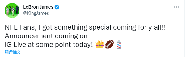 詹姆斯还发推写道:NFL(橄榄球联赛)球迷们,我为你们准备了一些特别的事!今天的某个时段,我会在INS的直播中宣布该消息!