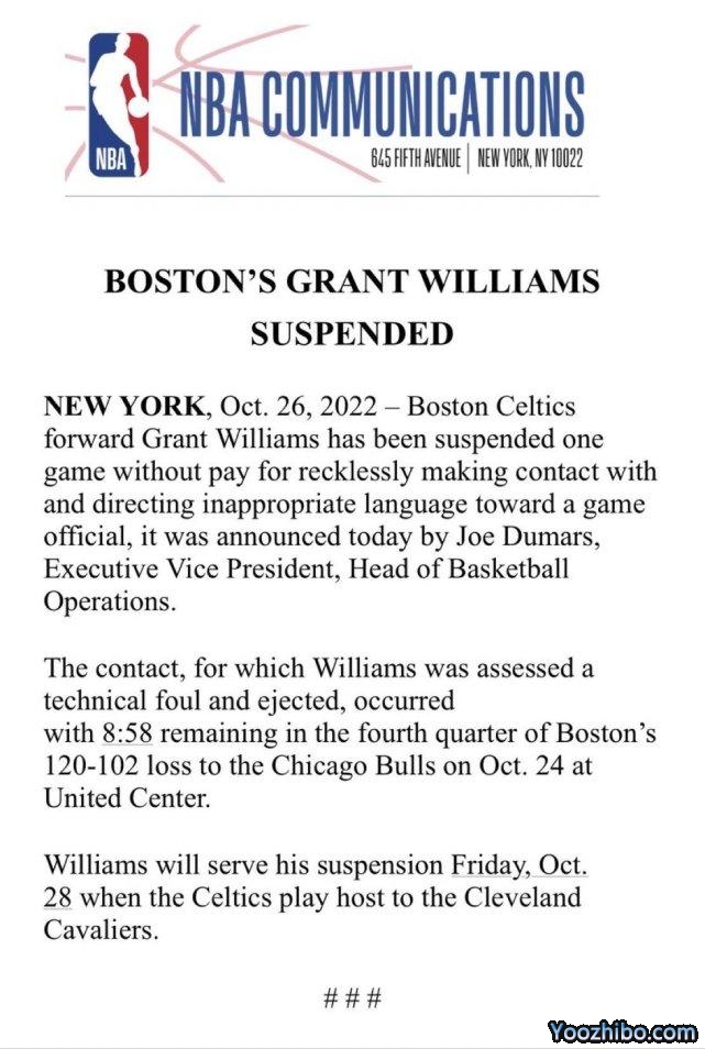 来源:JRS直播网10-27 21:05JRS直播网讯10月27日,NBA官方宣布,波士顿凯尔特人前锋格兰特-威廉姆斯因“鲁莽”冲撞一位裁判,以及对她使用“不当语言 ”,而被停薪禁赛一场。