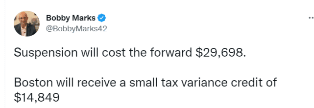 薪金专家Bobby Marks表示,格威将因禁赛一场损失29698美元的薪水,而凯尔特人则将会少交14849美元的奢侈税。