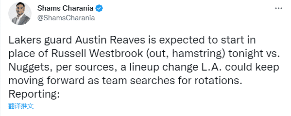 据名记shams报道,威少因腿筋伤势将缺席今天湖人与掘金的比赛,湖人变阵,里夫斯顶替威少首发出战;名嘴A-史密斯直言下一场对阵森林狼威少将会替补出战,甚至爆料威少想要离开湖人;另外名记沃纳罗斯基表示威少沦为替补是不可避免的。
