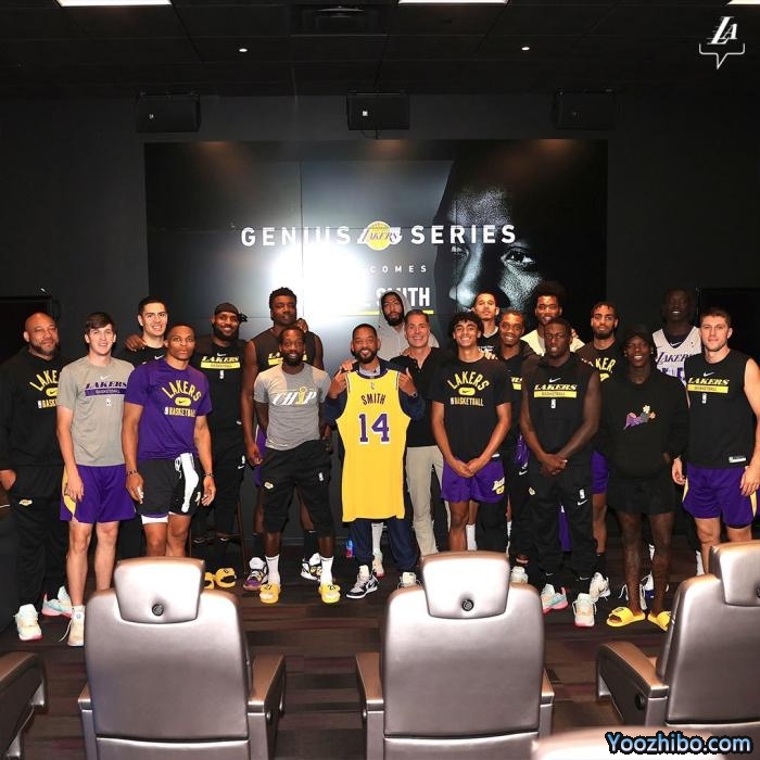 在湖人全队与史密斯合影中,佩林卡搂着嘉宾,影帝史密斯手持纪念款14号湖人球衣;贝弗利与史密斯站在一起,施罗德、威少、纳恩、克里斯蒂、里夫斯都站在第一排;詹姆斯搂着斯威德和托马斯-布莱恩特,浓眉站在最后一排,戴着帽子表情严肃。