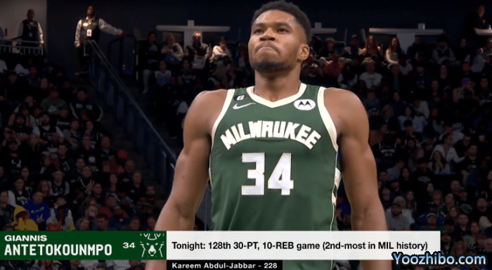 3、字母哥生涯第128场单场轰下30+10的数据,排名雄鹿队史第二,贾巴尔曾228次做到,位居队史第一。