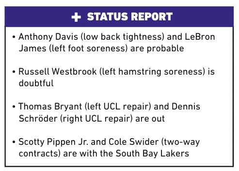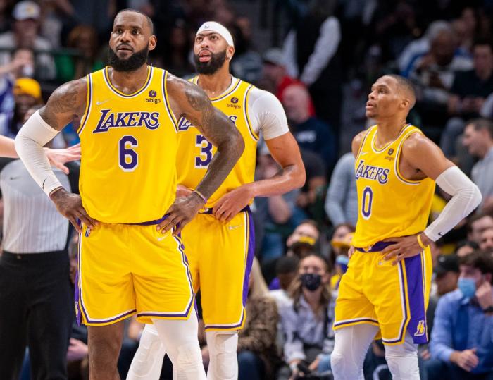 湖人三巨头都有伤,两人伤停两人暂时离队前往发展联盟,相当于湖人至少4名球员将缺战掘金;威少因腿筋伤病(左腿筋酸痛)小概率出战下一场与掘金的比赛,出战概率仅25%;据湖人记者报道,湖人今天训练之后,威少和其他队友一起在场上徘徊。
