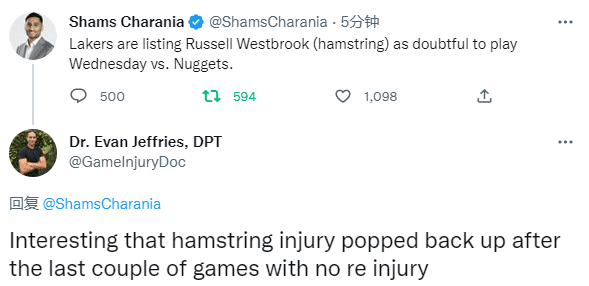 对于威少的腿筋伤势,医学专家Evan Jeffries有些好奇,发推写道:过去几场比赛,威少都没有在伤病名单上,现在却突然遭遇腿筋伤病。