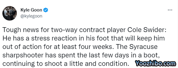 据湖人记者Kyle Goon报道,斯威德因右脚应力性骨折至少伤停4周,过去今天,他一直穿着保护靴,并且继续进行投篮训练。