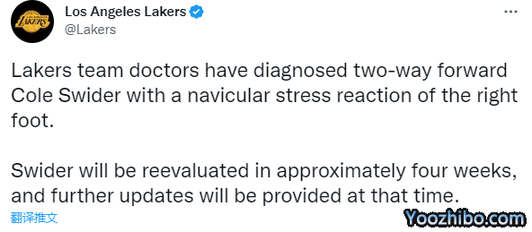 湖人又遭打击:官宣神射右脚应力性骨折 因伤至少伤停4周
