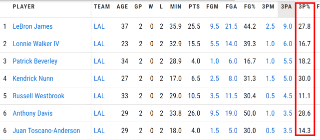 这应该是湖人目前最大的问题。开季前两场,湖人三分球85投19中,三分命中率只有22.4%,在30支球队里排名倒数第一,而且差距还不小。湖人的三分是独一档的差,三分命中率第29位的森林狼是29.6%,还比湖人高出7个多百分点。