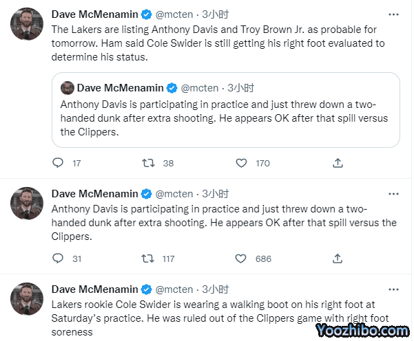 开赛至今,詹眉一直都在伤病名单上,不过他们并没有缺席过比赛;上一场湖人不敌快船,浓眉防守小卡时重摔倒地险些遭遇伤病,今天训练中,浓眉完成了双手暴扣,这说明他的身体无大碍。