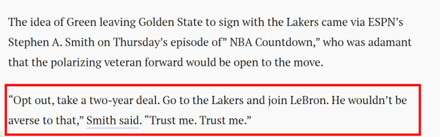 “选择跳出合同,签下一份两年的新合同。去湖人队,加入勒布朗的球队,他不会反对这么做,”史密斯说道,“相信我,相信我。”史密斯的看法得到不少人的支持,因为格林和詹姆斯的私交很深,休赛期经常一起参加活动,两人的经纪人也同为里奇-保罗。