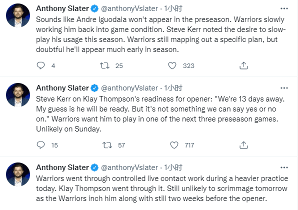对于汤普森的情况,Anthnoy Slater表示勇士今天进行了受控的对抗训练,汤普森经历了这一切,明天他仍不太可能参加全场对抗训练,因为勇士想要让汤普森慢慢来。