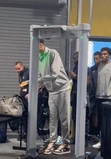 最后来看一个小花絮和一张照片。文班亚马身高2米24, 这到底有多高?只见他在进入球馆时,过安检门都需要低下脑袋。有记者站在文班亚马的鞋子旁拍照,巨人的鞋子真是太震撼了!