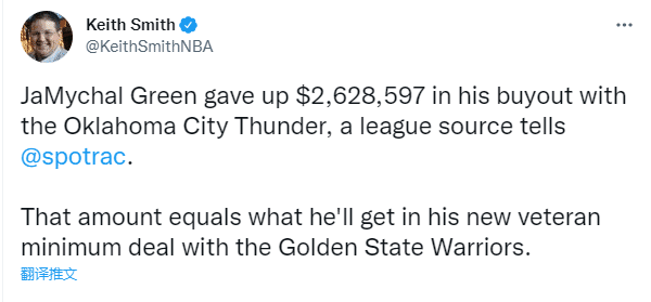 据名记Keith Smith报道,贾麦考-格林在和雷霆买断过程中放弃了2628597美元,而这个数额相当于他在勇士的老将底薪。