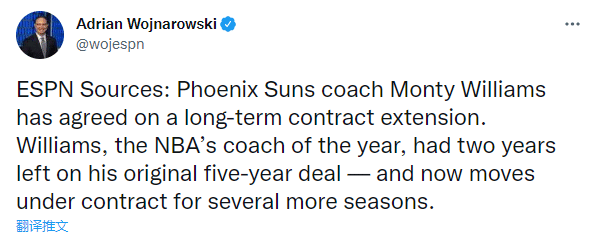 据espn名记沃纳罗斯基报道,菲尼克斯太阳队已经和主帅蒙蒂-威廉姆斯提前续签长约,未来继续带队冲击总冠军。