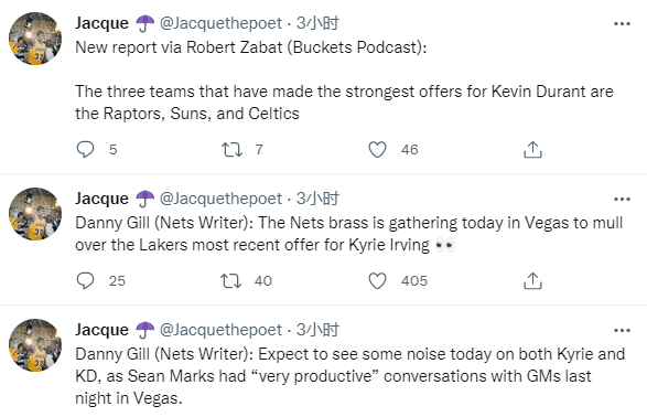 据篮网撰稿人Danny Gill报道,今天篮网高管聚集在拉斯维加斯,考虑湖人最近对欧文的交易报价;预计将会有更多的杜兰特、欧文交易流言,昨晚马克斯和其他球队的总经理们进行了非常富有成效的谈话。