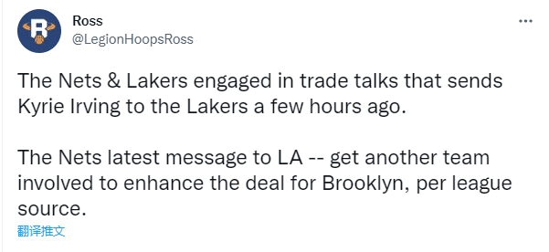 据美媒Legion Hoops记者Ross报道,篮网与湖人在几个小时前再次就欧文交易进行了商谈,篮网要求湖人拉入第三方进行多方交易,以保障自己的收益最大化。