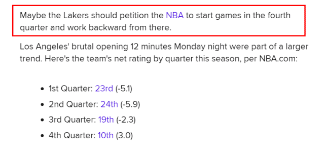 来源:JRS直播网03-16 15:37JRS直播网讯讯 北京时间3月16日,美媒调侃湖人应该向联盟申请,比赛只打第四节。当然调侃归调侃,美媒也表示记分牌在第一节后不会重置,湖人在垃圾时间超越对手也毫无意义。霍顿-塔克和威少在昨天的赛后采访都表示,不知道为什么湖人总是慢热。