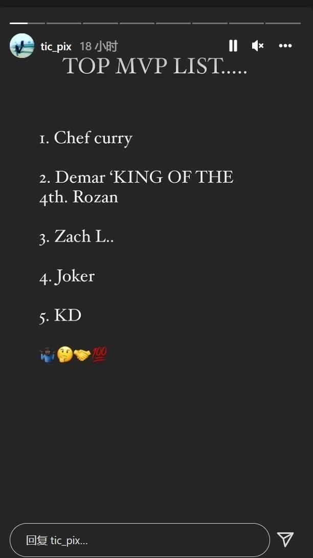 加内特此前曾谈论本赛季的MVP话题,并在社媒上列出了他心目中的前五:库里、德罗赞、拉文、约基奇和杜兰特。他把库里也排在了首位。