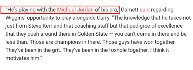 加内特是在谈论维金斯时,提到了库里。“他(维金斯)正在和这个时代的迈克尔-乔丹一起打球。他能从科尔和教练组里学到东西……这支曾经夺得冠军的球队,激励维金斯打出好的表现。”