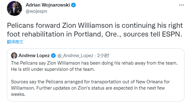 鹈鹕将在未来几周更新锡安的伤病报告。