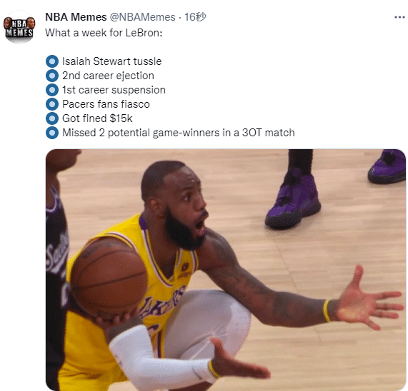 最近一段时间,詹姆斯遇到的事情真不少——19年生涯首次禁赛;因不雅庆祝动作(卡塞尔舞步)被罚款1.5万美元,还因回应禁赛说脏话而被联盟警告;今天三加时惜败残阵国王,詹姆斯两次错失绝杀;这个赛季的湖人赢球太难,打谁都是五五开,如此情况靠什么夺冠?球队的问题太多了。