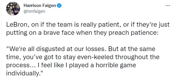谈到本场个人7次失误,詹姆斯直言:我觉得我个人打了一场可怕的比赛;詹姆斯还说:我必须让这支球队变得更好。