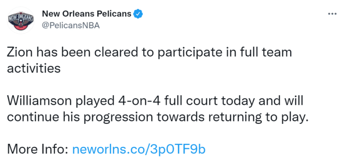 鹈鹕官宣好消息!锡安获准参加全部训练:今日已打全场4对4比赛