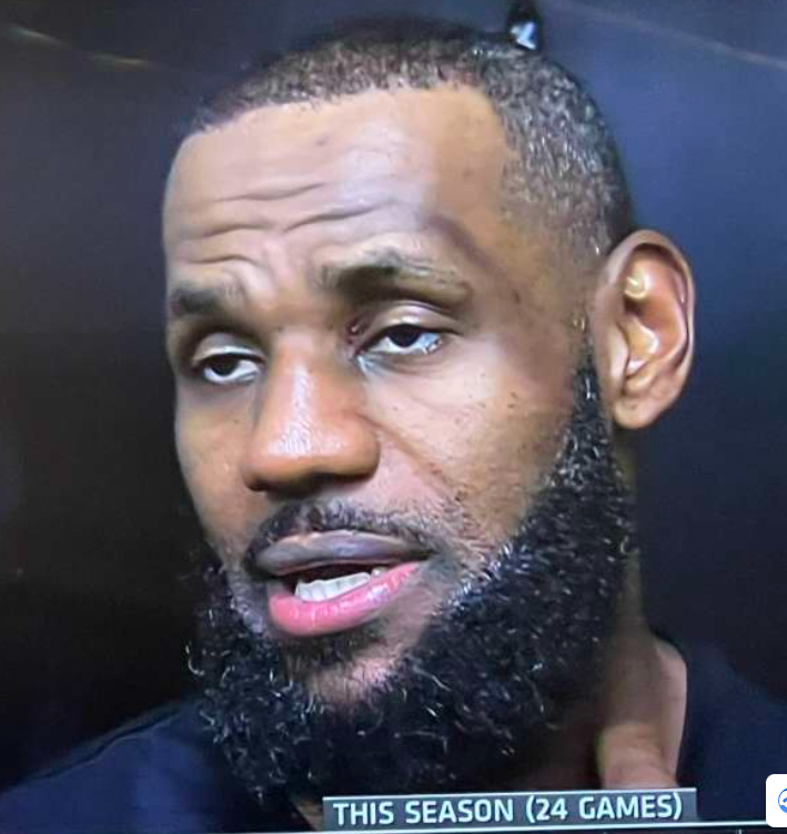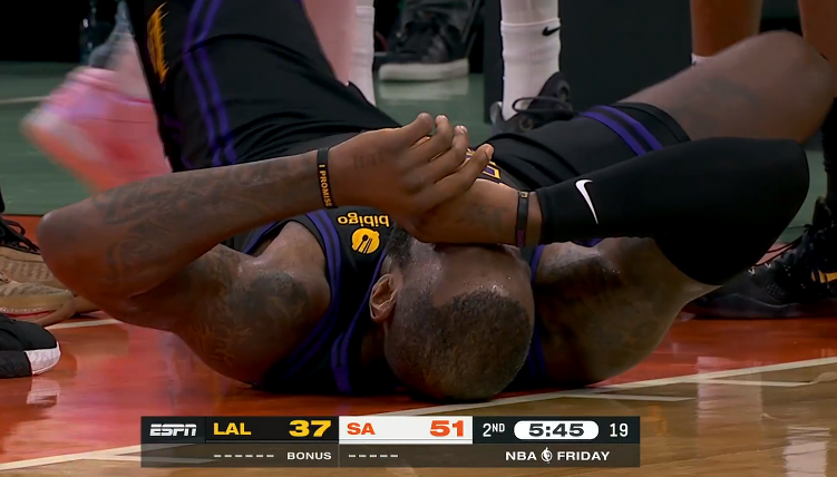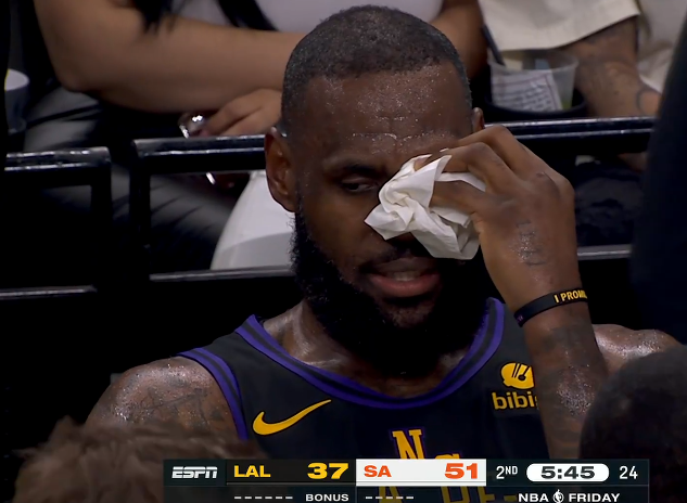 在输给马刺一战,詹姆斯的眼睛被戳了三次且血洒赛场——第二节被科林斯插眼,痛苦倒地并下场接受检查;之后詹姆斯的左眼被文班亚马打了一下;下半场第三节,詹姆斯被队友八村垒一巴掌打到眼睛和鼻子,鼻子被打出血,血染赛场,全场拿到23分14助攻7篮板仍无缘带队逆转。