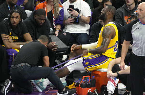 在上一场湖人险胜太阳的比赛中,詹姆斯与杜兰特相撞受伤,小腿受伤后一瘸一拐坚持罚球,随后坐回替补席接受紧急治疗,带伤打完比赛并且全场轰下32分11篮板6助攻率队拿下比赛。