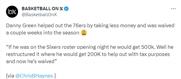据名记Chris Haynes报道,丹尼-格林主动将自己的首秀奖金从50万美元降低至20万美元,以求让76人更好建队,但他还是在涉及哈登的交易中被球队裁掉。