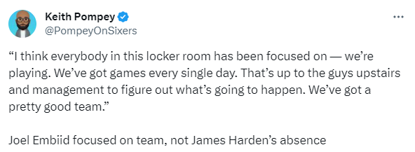 恩比德接受采访,谈到哈登何时回归时,他表示:我不确定,我也不知道。我认为更衣室里的每个人都专注于我们正在进行的比赛,我们每天都有比赛。 这(哈登何时回归)取决于管理层来弄清楚,我们有一支非常优秀的团队。