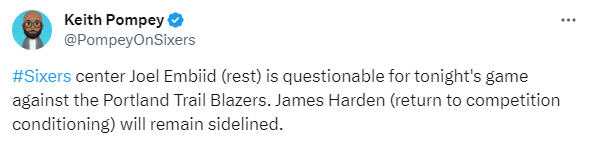 76人今天将在主场揭幕战对阵开拓者,据76人跟队记者Keith Pompey报道,恩比德(轮休)出战成疑,哈登(需要恢复比赛状态)继续缺席比赛。