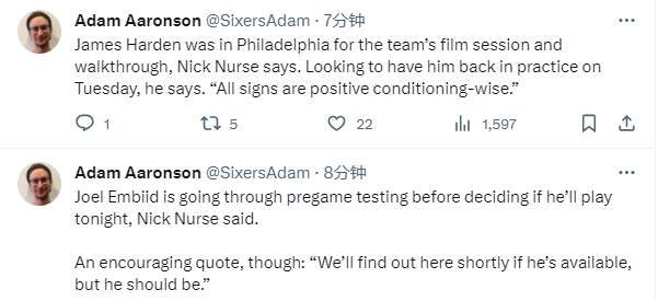 纳斯还表示恩比德将在赛前接受测试,他应该可以出战今天的比赛。