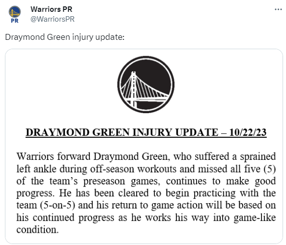 勇士官方声明:德雷蒙德-格林在休赛期训练中扭伤左脚踝,缺席了球队全部的五场季前赛;目前他仍在继续取得良好的进步, 他已获准开始与球队一起训练(5对5),他能否重返比赛将取决于他在进入比赛状态时的持续进步。