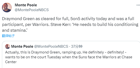 Monte Poole表示格林绝对想要参加勇士揭幕战与太阳的比赛,科尔表示:他需要增强体能和耐力。