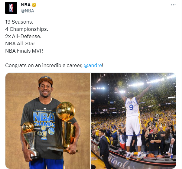 NAB官方列出伊戈达拉的生涯荣誉:19个赛季,4座总冠军,2次最佳防守阵容,NBA全明星和NBA总决赛MVP,恭喜你取得了令人难以置信的职业生涯。
