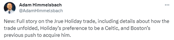 据AdamHimmelsbach报道,凯尔特人老板给管理层的明确下令要不惜一切代价夺冠,换来霍勒迪便是其中的重要一步。