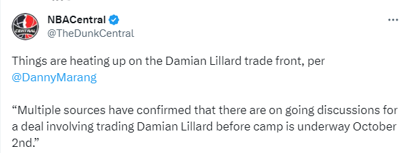 开拓者记者Danny Marang表示:多位消息人士证实,在10月3日新赛季NBA训练营开始前,有关利拉德交易讨论正在进行着。据我了解,这并不意味着开拓者只会接受或者达成协议,如果他们找不到自己喜欢的筹码,就会把利拉德带到训练营中去。