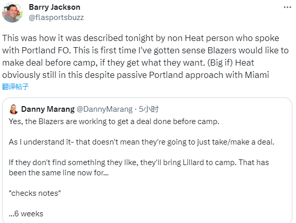 热火记者Barry Jackson转发Marang的推文,并写道:这是我第一次意识到开拓者希望在训练营开始前达成(利拉德)交易,如果他们能得到自己想要的(筹码)。而热火显然仍旧处于这种状态,尽管他们和开拓者进行过‘被动’接触。