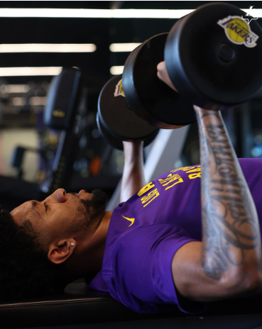 27岁的伍德身穿湖人紫色训练T恤,在球队的健身房中苦练力量,积极备战新赛季。