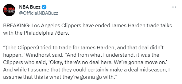 Brian Windhorst在《Hoop Collective》节目中谈到关于哈登交易的话题,他表示:快船曾试图交易得到哈登,但这笔交易没有发生。我的理解是,快船认为‘好吧,不会有交易了。我们得向前看。’尽管我认为他们会在赛季中期交易得到哈登,但这(向前看)就是他们目前要做的。